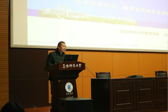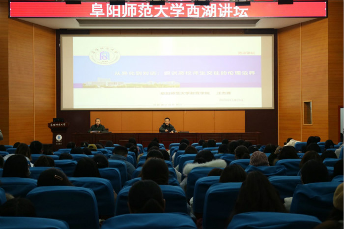 为营造良好的校园学术氛围,进一扩大学校学术影响力,11月25日下午,由科研处主办,党委宣传部、校团委协办,教育学院承办的2020年第4场“西湖讲坛”在躬行F楼报告厅开讲。本次讲座的主题为“从异化到对话:摭谈高校师生交往的伦理边界”,教育学院小学教育专业教研室主任汪杰锋担任主讲,教育学院院长李欢主持,全校两百余名师生参与聆听。