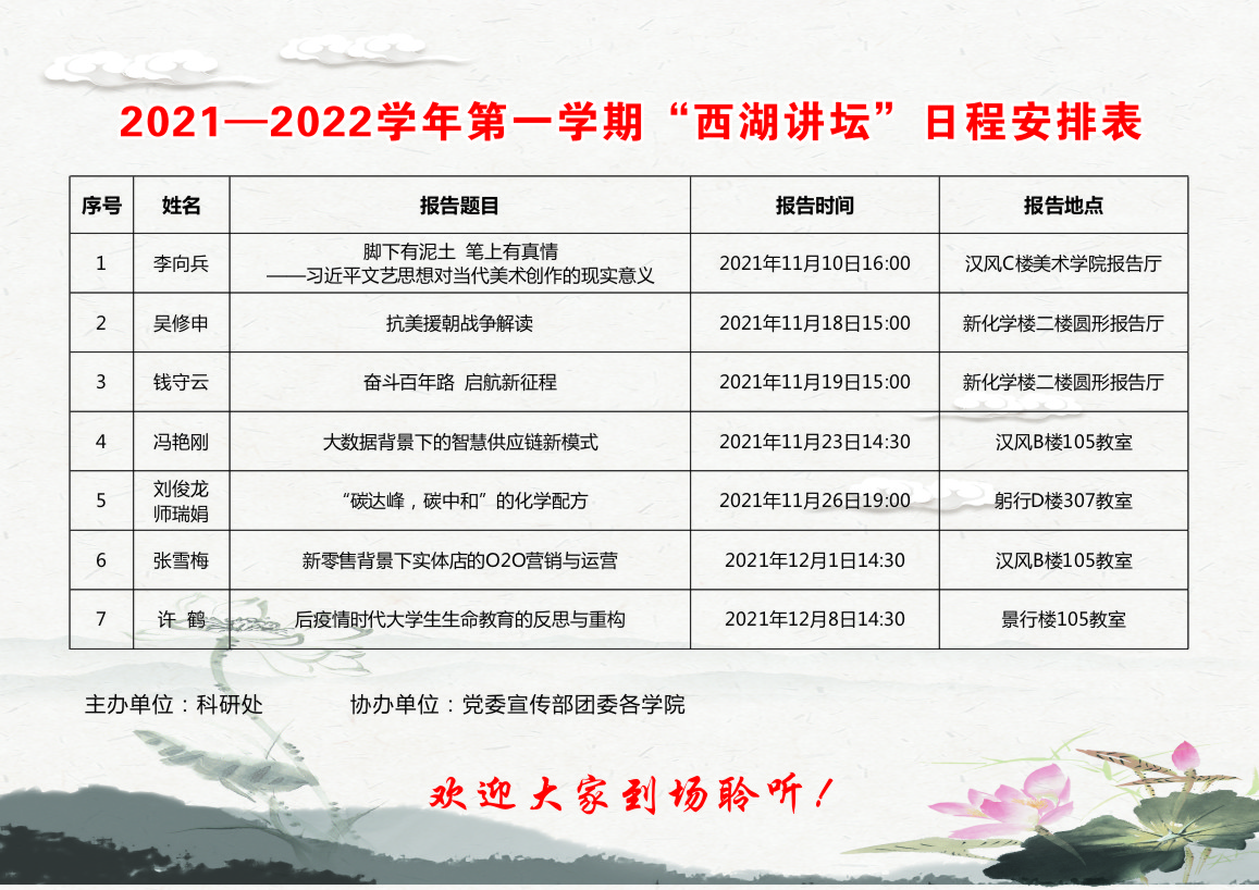 2021—2022学年第一学期“西湖讲坛”日程安排表