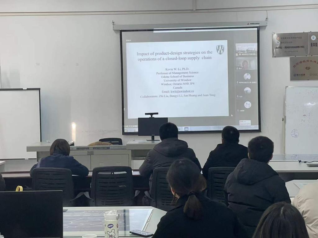 12月17日上午,应商学院和经济学院的邀请,加拿大温莎大学Odette商学院管理科学系教授、博士生导师Kevin W. Li为广大师生作了题为“Impact of product-design strategies on the operations of a closed-loop supply chain”的学术报告,报告由商学院朱剑锋院长和张雪梅教授主持,商学院和经济学院教师、研究生及本科生通过线上或线下方式参加了报告会。