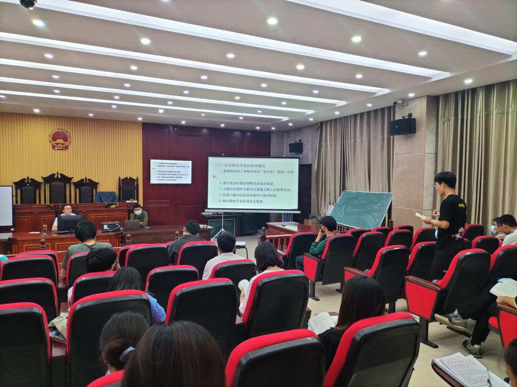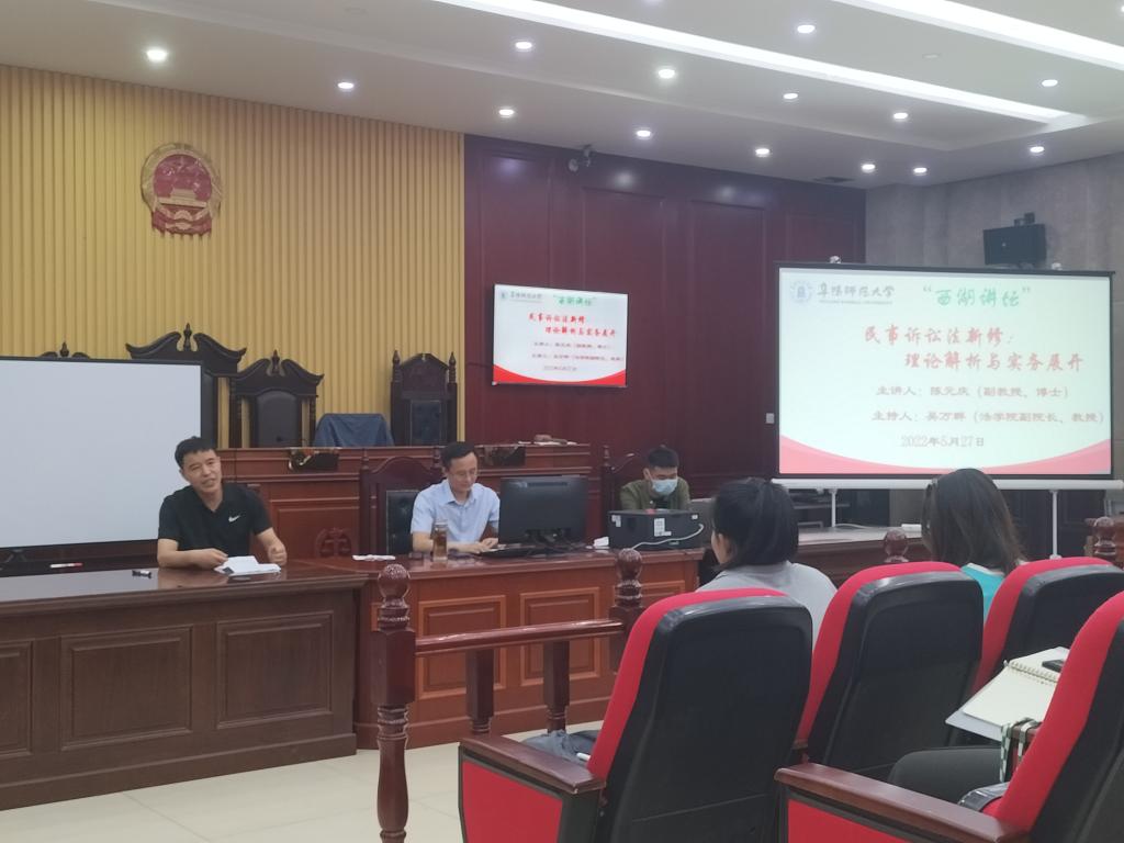 5月27日晚上,由校科研处主办,党委宣传部、团委协办,法学院承办的“西湖讲坛”在西湖校区模拟法庭成功举办。讲座题目为“民事诉讼法新修:理论解析与实务展开”,由法学院副教授陈元庆老师主讲,法学院副院长吴万群教授主持。在充分做好防疫基础上,全校各专业200余名师生通过线上和线下方式聆听了讲座。