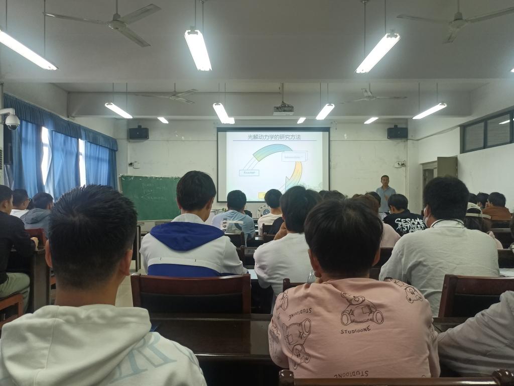 张志国博士介绍了什么是光解动力学,以及光解动力学在大气环境、星际空间、燃烧化学等领域重要支撑作用,并从臭氧层的破坏详细介绍了光解动力学和我们生活环境的关系。光解动力学和我们日常生活存在着紧密的联系,通过水分子的光解动力学研究,张志国博士介绍了离子速度成像原理及影像信息的提取。张志国博士还勉励同学们要做有理想、敢担当、能吃苦、肯奋斗的有志青年。