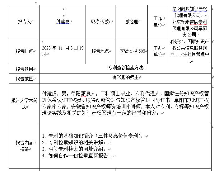 学术报告通告——专利查新检索方法