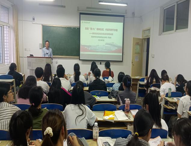 为进一步推进校园学术交流活动的开展,扩大优秀学术成果的普及,营造浓郁的校园学术氛围,5月10日晚,由科研处主办、马克思主义学院承办的2023-2024学年第二学期第5场“西湖讲坛”在三里桥校区A楼403教室举办,本次讲座由马克思主义学院于文善教授主讲,主题为“阜阳‘四·九’精神生成、内涵与时代价值——兼谈地方红色文化传承与弘扬问题”,思想政治教育(师范)专业学生参加。