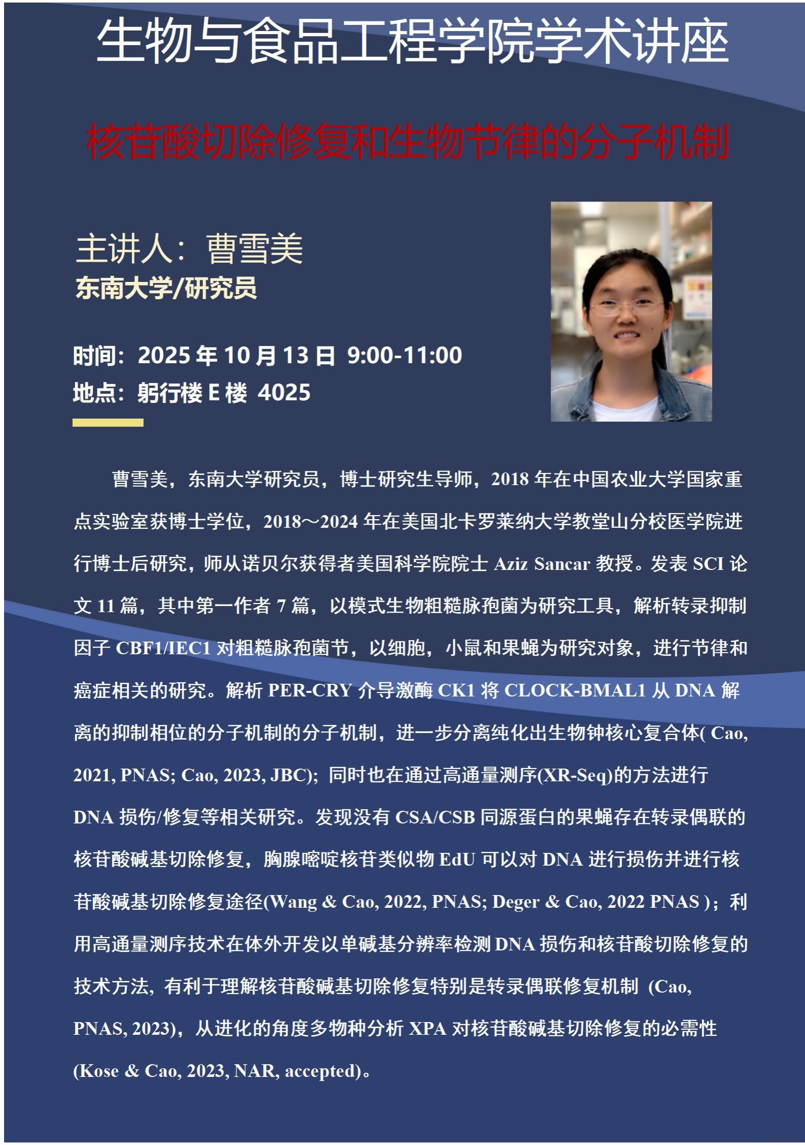 生物与食品工程学院学术报告通告——核苷酸切除修复和生物节律的分子机制