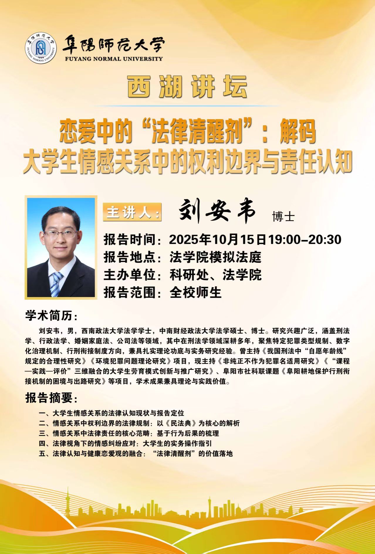 西湖讲坛通告——恋爱中的“法律清醒剂”:解码大学生情感关系中的权利边界与责任认知