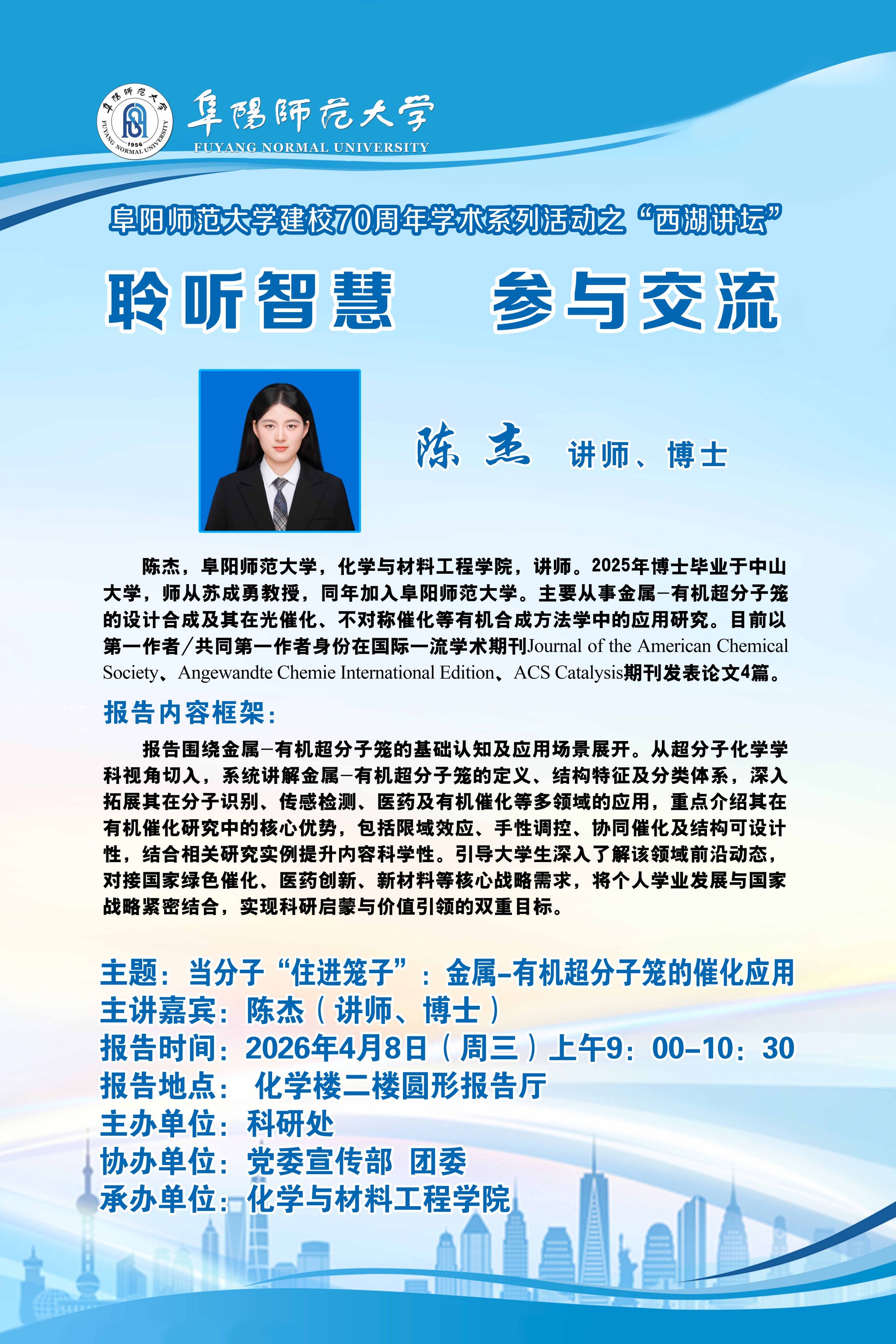 西湖讲坛通告——当分子“住进笼子”:金属-有机超分子笼的催化应用