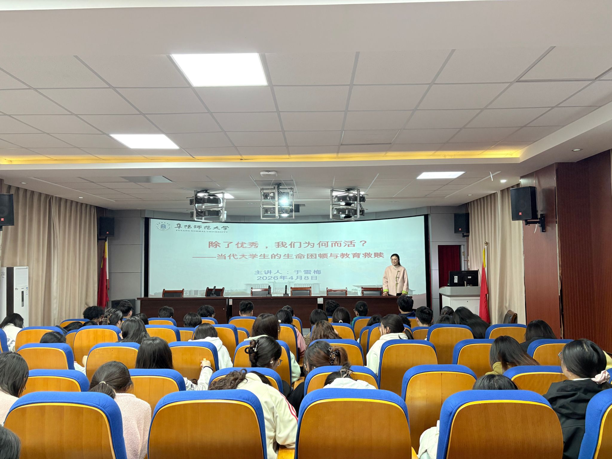 4月8日下午,由科研处主办,党委宣传部、团委协办,历史文化与旅游学院承办的“西湖讲坛”暨学院“书香历旅”系列讲堂2026年第4期在西湖校区汉风楼209室举办。本次讲座特邀历史文化与旅游学院副教授于雪梅担任主讲,以《除了优秀,我们为何而活?——当代大学生的生命困顿与教育救赎》为题,与在场学子展开了一场关于生命意义与价值的深度对话。