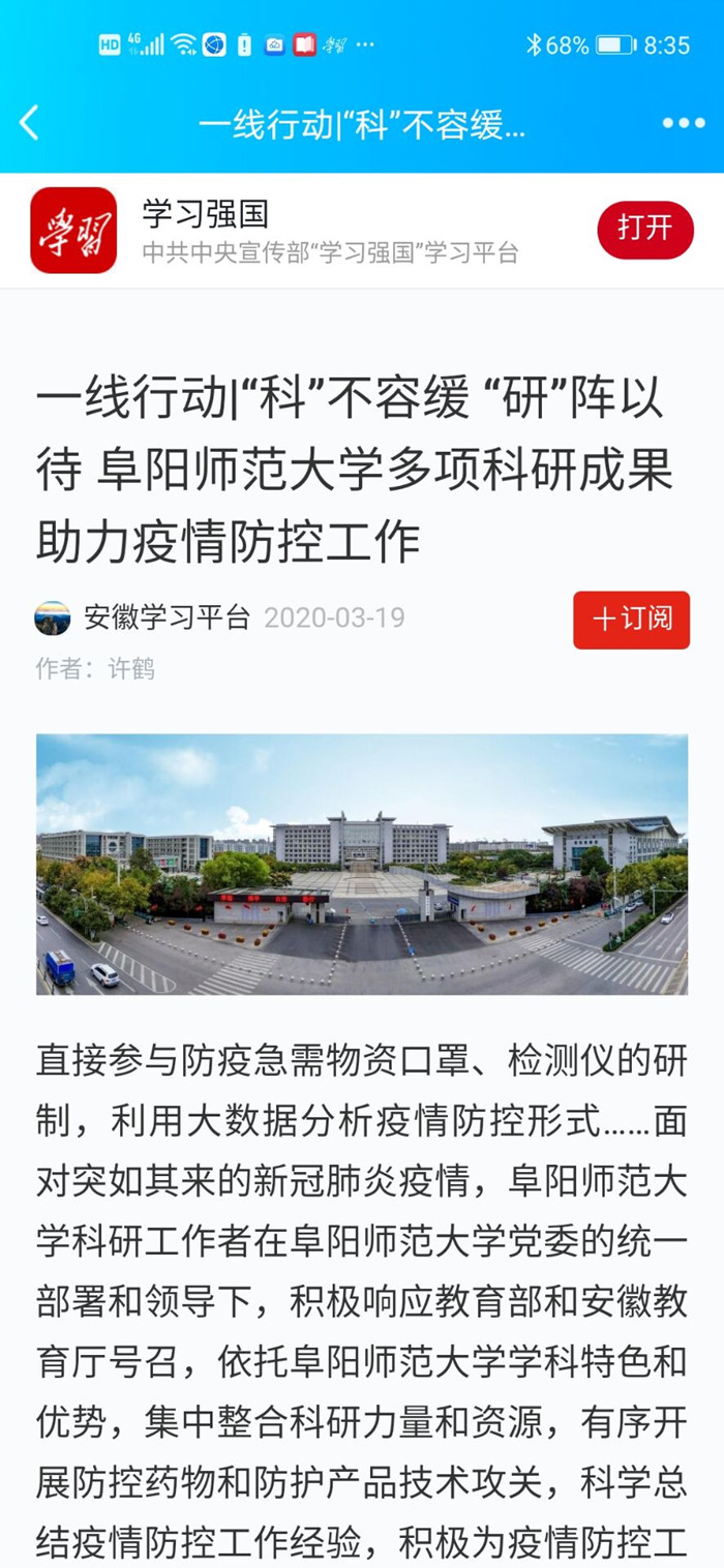 3月19日,“学习强国”学习平台报道:一线行动|“科”不容缓 “研”阵以待 阜阳师范大学多项科研成果助力疫情防控工作。文章地址: