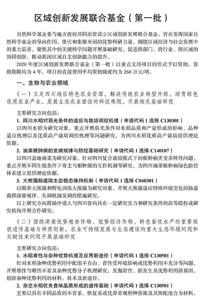 国家自然科学基金委发布《2020年度国家自然科学基金项目指南》,现将其中联合基金项目的区域创新发展联合基金(第一批)申请转发给你们。区域创新发展联合基金,旨在发挥国家自然科学基金的导向作用,吸引和集聚全国的优势科研力量,围绕区域经济与社会发展中的重大需求,聚焦其中的关键科学问题开展基础研究,促进跨部门、跨行业、跨区域的协同创新,推动我国区域自主创新能力的提升。