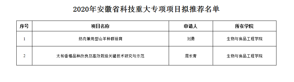 2020年度安徽省科技重大专项项目的推荐工作已经完成,经个人申请、学院推荐、专家评审,学术委员会推荐等程序,现将我校拟推荐的项目进行公示(2020年8月20日至8月22日),公示期内如有异议请以实名书面材料形式反馈至科研处办公室,联系电话:2596562。