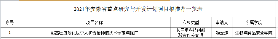 我校拟推荐项目“超高密度矮化反季太和香椿种植技术示范与推广”,申请人金继良,因年龄原因,现申请将该项目申请人更换为该项目第一参与人姬云涛。经个人申请,所在学院同意,现该项目拟推荐情况进行公示(2020年12月25日至12月27日),公示期内如有异议请以实名书面材料形式反馈至科研处办公室,联系电话:2596562。