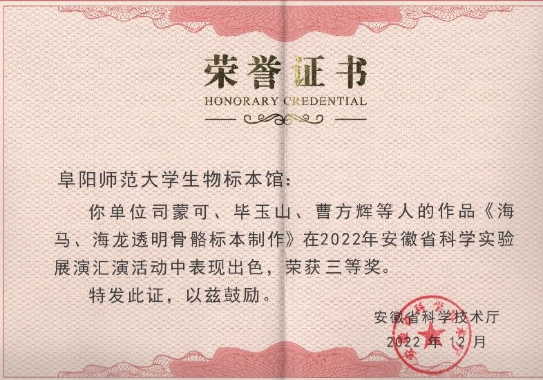 2022年度,在安徽省科技厅举办的科普讲解类赛事中,我校学子获得多项荣誉。其中,我校安徽省科普基地——阜阳师范大学生物标本馆及依托生物食品工程学院选拔报送的作品(《海马、海龙透明骨骼标本制作》和《家禽的病理解剖》)在安徽省科学实验展演汇演比赛中分别荣获得三等奖和优秀奖;由校生物标本馆选送的作品《兽类标本讲解》和《翱翔者》在安徽省优秀科普微视频比赛中荣获优秀奖。在该系列比赛中,指导教师李永民和团队成员精心组织素材,齐心协力不断完善作品,最终取得了优异成绩,为学校赢得了荣誉。