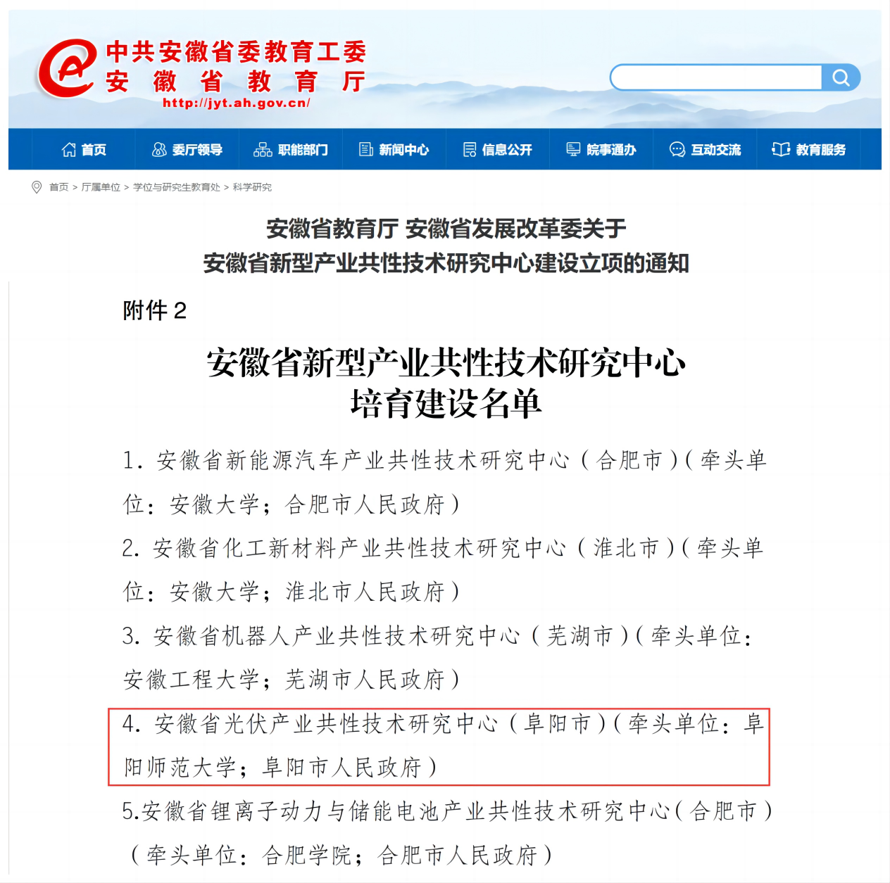 省教育厅和省发展改革委公布了安徽省首批新型产业共性技术研究中心建设立项单位,由学校和阜阳市人民政府联合牵头申报的“安徽省光伏产业共性技术研究中心”入选。