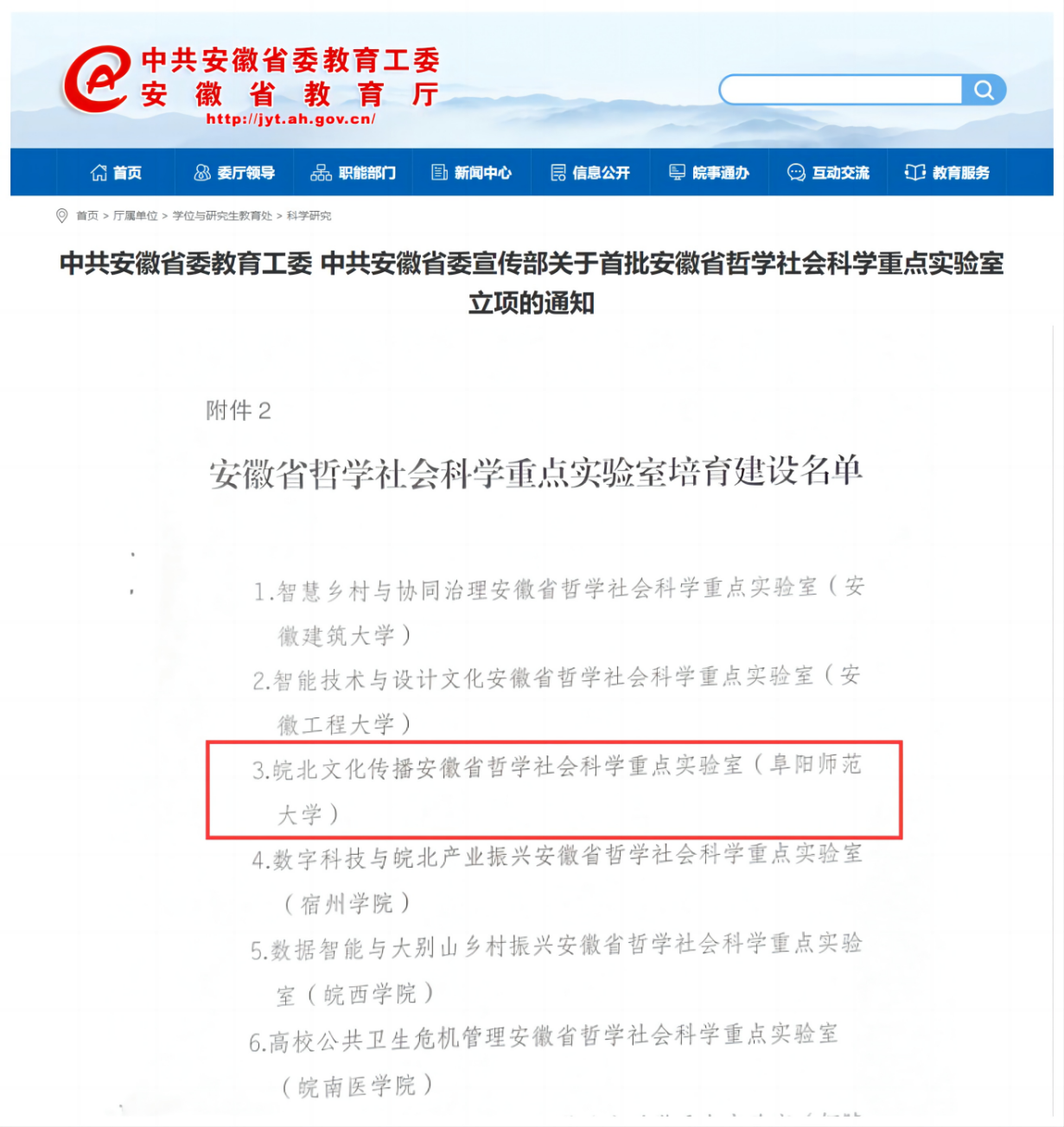 省委教育工委和省委宣传部公布了首批安徽省哲学社会科学重点实验室立项名单,学校申报的“皖北文化传播安徽省哲学社会科学重点实验室”成功入选首批重点实验室培育建设。