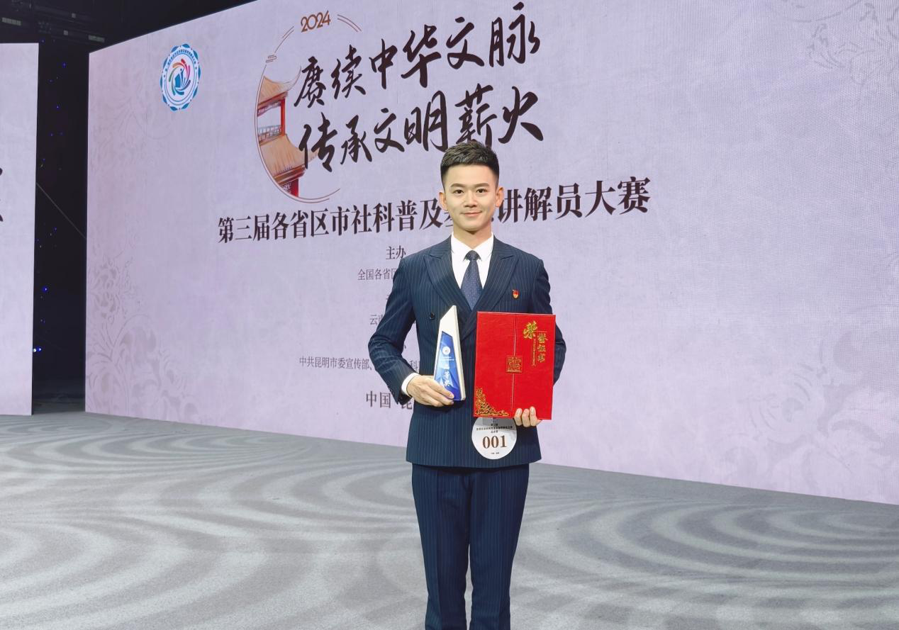 第三届全国社科普及基地讲解员大赛以“赓续中华文脉 传承文明薪火”为主题,讲述中华优秀传统文化传承发展故事。范俊鹏是由阜阳市社科联选送,经过半决赛和总决赛两轮比赛的激烈角逐,成为安徽省唯一入围总决赛的选手,以精湛的讲解水平、丰富的社科知识储备和沉着的临场表现,最终获全国二等奖。