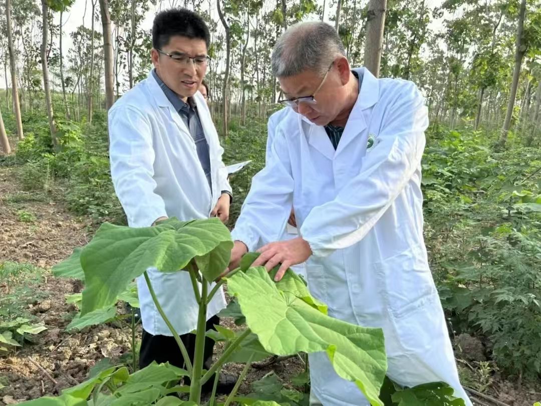 金继良(右)在野外观察泡桐叶片。