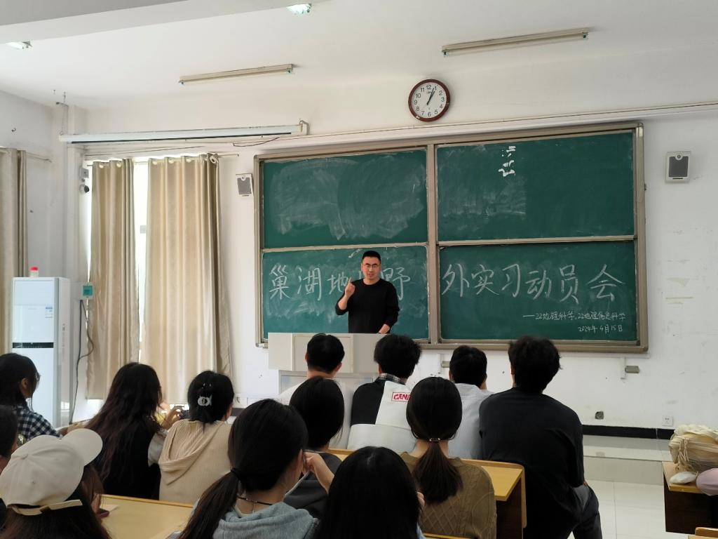 4月15日,地理系在汉风A楼111教室召开巢湖地质野外实习动员会,胡文峰、袁周伟、张苗苗、李丰凯、曹阳和赵阳六位老师及2022级地理科学(师范)专业和2022级地理信息科学全体学生,会议由赵阳主持。