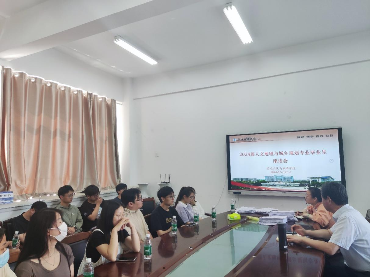 5月20日下午,学院2024届人文地理与城乡规划专业毕业生座谈会在汉风B楼333会议室召开。座谈会由学院院长梁家贵院长主持,人文地理与城乡规划专业教研室主任黄鹏娜、教师张苗苗以及毕业生代表参加。