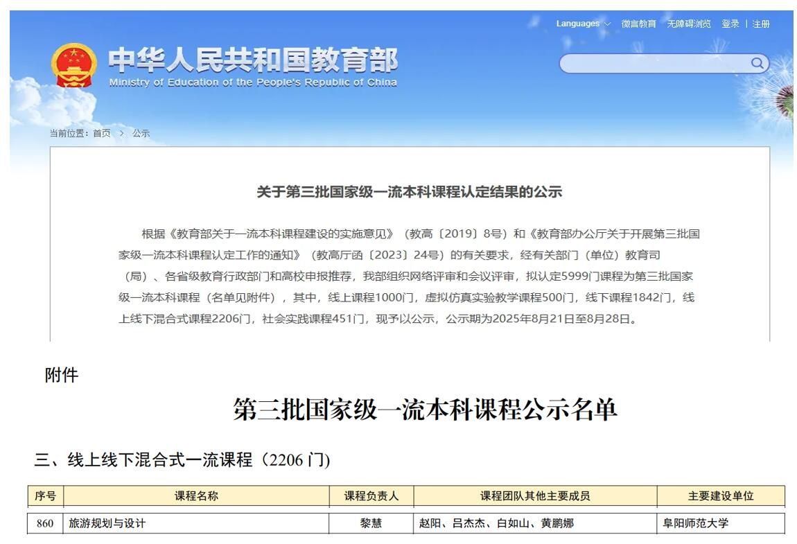 近日,教育部高等教育司发布《关于第三批国家级一流本科课程认定结果的公示》,我院教师黎慧副教授团队的《旅游规划与设计》课程成功入选,被认定为国家级线上线下混合式一流本科课程,实现我院在该类别国家级一流课程中的首次突破。