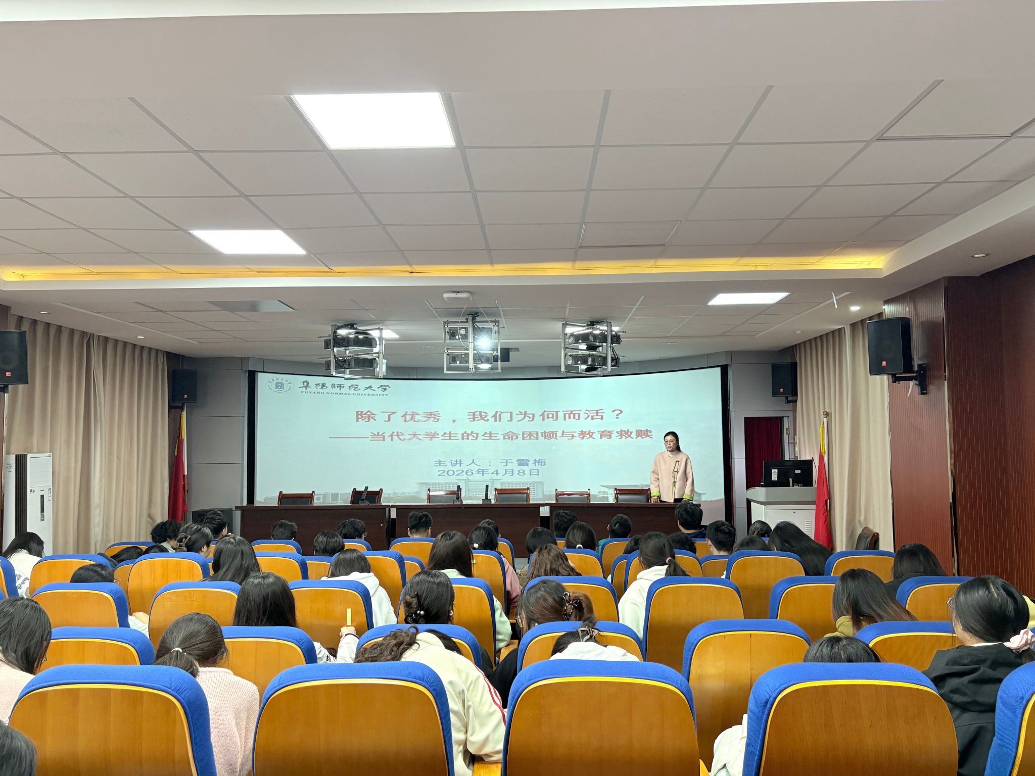 4月8日下午,为庆祝阜阳师范大学建校70周年,由科研处主办,党委宣传部、团委协办,学院承办的“西湖讲坛”暨学院“书香历旅”系列讲堂2026年第4期在西湖校区汉风楼209室举办。本次讲座特邀学院副教授于雪梅担任主讲,以《除了优秀,我们为何而活?——当代大学生的生命困顿与教育救赎》为题,与在场学子展开了一场关于生命意义与价值的深度对话。
