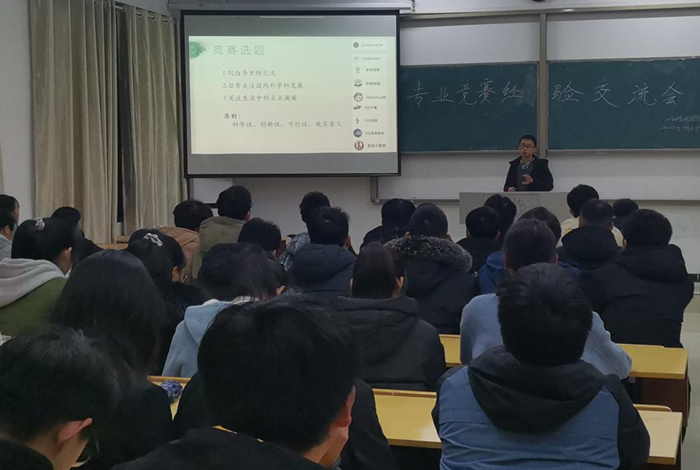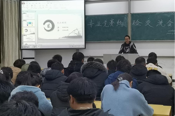 在交流会上,王华同学从竞赛选题、团队组织、日常工作和成果汇报四个模块总结了大学四年参加专业竞赛的过程和心得,主要有:竞赛选题要有创新性、科学性、实践性;团队组织要目标一致、协调配合;日常工作要内容明确、进度清晰;成果汇报要注重细节、气势稳重;并条理清晰地为同学们梳理了竞赛流程,普及了基本知识,指明了奋斗目标。张猛同学以自身个性发展为基础,从大学四个学年段,简要介绍了自己所参加的各项比赛,以及所培养的兴趣爱好,并且结合专业竞赛的个人作品展示,总结了参赛作品的制作过程和经验,直观地展示了各项专业竞赛的重点,让同学们进一步了解专业学科竞赛。