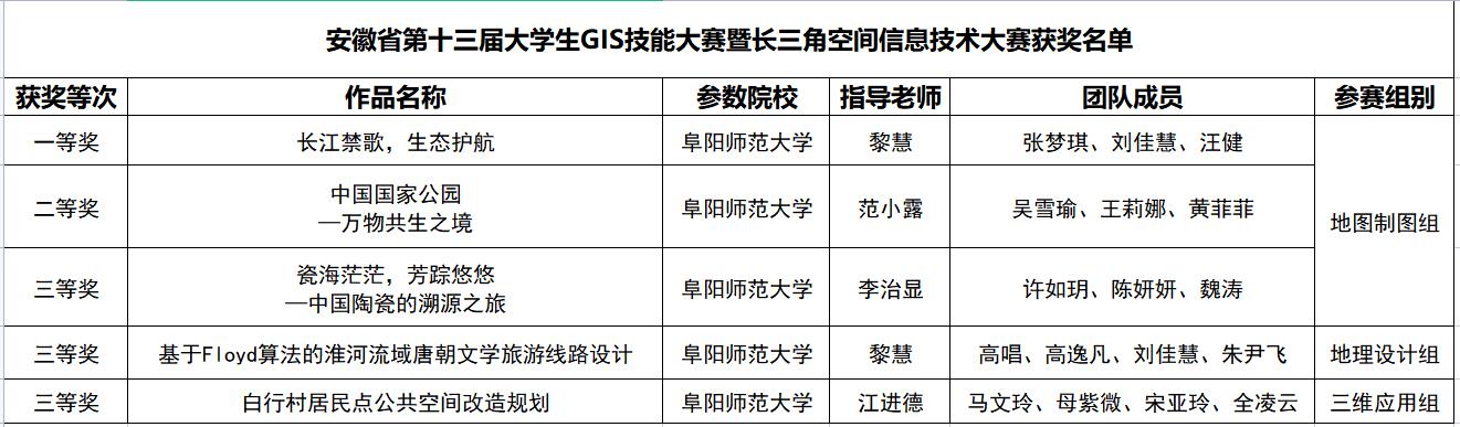 8月23日至24日,由安徽省地理信息中心主办的安徽省第十三届大学生GIS技能大赛暨长三角空间信息技术大赛在合肥举办,此次比赛由来自长三角地区13所高校的133支团队同场竞技。经过紧张激烈的角逐,我院参赛队伍表现优秀,共获得A组地图制图组一等奖一项、二等奖一项、三等奖一项,B组地理设计组三等奖一项,C组三维应用组三等奖一项的好成绩,黎慧、范小露、李治显、江进德老师获“优秀指导教师”。