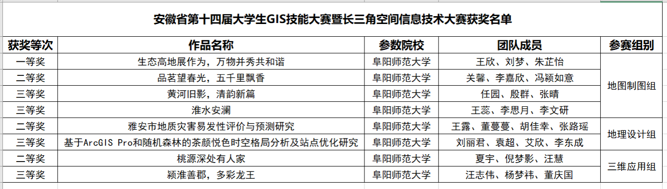 8月27日至28日,由安徽省地理信息中心主办的安徽省第十四届大学生GIS技能大赛暨长三角空间信息技术大赛在合肥成功举办,来自长三角地区16所高校的140支团队参赛。经过紧张激烈的角逐,学院参赛队伍表现突出,共获得A组地图制图组一等奖一项、二等奖一项、三等奖二项;B组地理设计组二等奖、三等奖各一项;C组三维应用组二等奖、三等奖各一项的好成绩。按照大赛规定,B组二等奖以上直接推荐参加国赛。此外,学院曹阳、韩平、白如山、黎慧、赵阳、吕杰杰等教师荣获“优秀指导教师”荣誉称号。