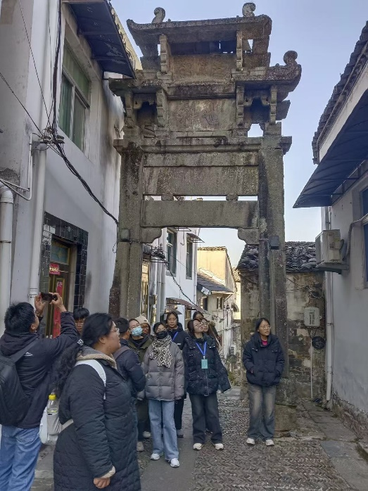 “览徽州”阶段,阜阳师范大学的获奖学子代表踏上了实地调研之旅。他们于徽州村舍阡陌中追寻只言片语,发现和感受徽州之美。在许村的专业导游讲解下,他们参观了薇省坊、三朝典翰坊等历史遗迹,聆听了“墙里门的故事”和“许家泽一门五博士、一村五院士、一家三代北大的奇观”,在展柜里、在墙壁上,不时地就会发现几件展示的宗族文书、科举和教育文书,还有革命文书等。这些珍贵的历史文献,如同历史的见证,让学子们感受着徽州文书的独特魅力,深刻领略着徽州文化的博大精深,对徽州文化有了更深的认识和理解。