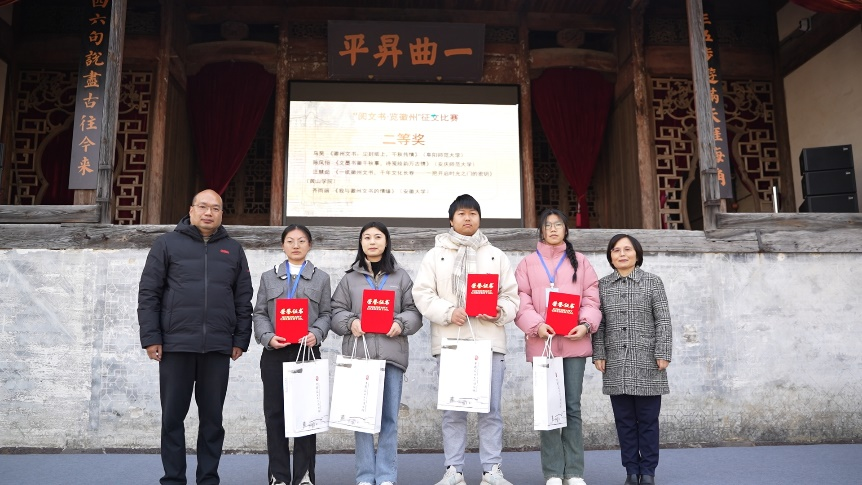 在历史的长河中,文化是民族灵魂,是血脉印记。近日,一场名为“阅文书·览徽州”的主题宣传教育活动颁奖仪式在安徽省文物局的指导下在黄山市徽州区潜口民宅博物馆圆满落幕,经过305篇征文、12个短视频的海选角逐,我院马昊、徐绍琪同学分别荣获征文比赛二、三等奖,杨静静同学荣获短视频比赛三等奖,我院梁舒予老师带队前往黄山潜口接受颁奖。