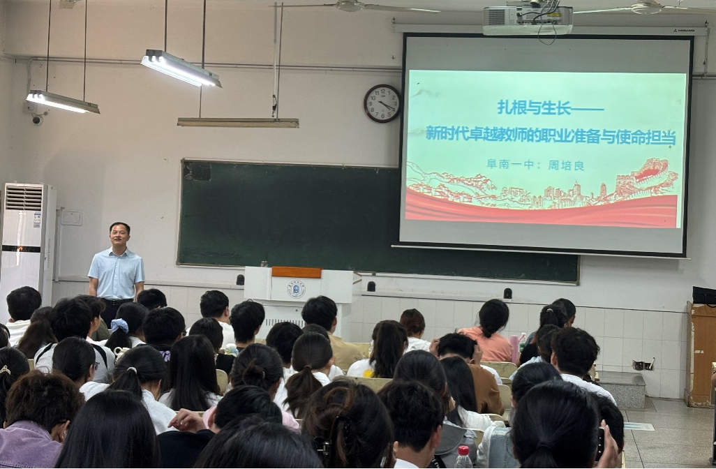 5月16日下午,应学院邀请,阜南一中党委副书记、副校长,高级教师周培良在西湖校区景行楼103教室作了题为“扎根与生长:新时代卓越教师的职业准备与使命担当”讲座。地理系教师、学科教学(地理)研究生、地理科学(师范)本科生150余人参会。讲座由地理系主任胡文峰博士主持。