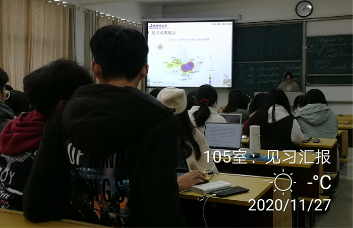 11月27日下午2019级人文地理与城乡规划专业全体同学在文科教学楼105教室开展见习周实训汇报工作。每位同学围绕自己采集实训样本数据、地图配准、地图矢量化、专题图绘制及GIS空间分析结果进行详细汇报(如图1)。