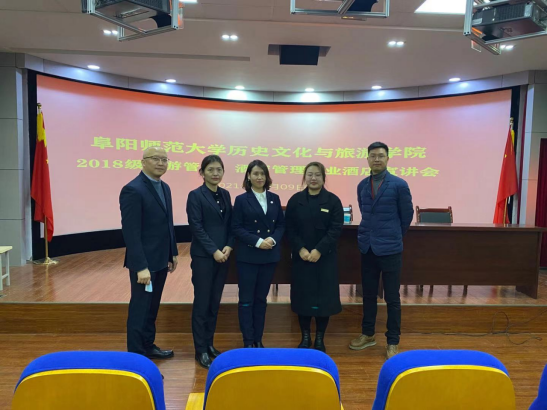 按照学校疫情防控和旅游系大三学生专业的培养要求,3月9日上午旅游系在西湖校区文科楼209导游模拟实验室,举办了酒店专业实习宣讲会。参会人员有旅游系副主任张松婷,旅游系王艳军老师,酒店方人事部门代表,2018级旅游管理一班、2018级酒店管理一班全体学生,会议由邹蒙老师主持。参与介绍会的酒店有阜阳市乐富强嘉悦酒店、白金汉宫大酒店、富力万达嘉华酒店、天筑豪生大酒店和宝龙温德姆至尊豪庭大酒店五家本地酒店。