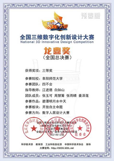 12月4日至5日,2021年数字科技文化节暨第14届全国三维数字化创新设计大赛(3D大赛)年度总决赛采用了线上为主的方式进行并完美落幕。我院2018级人文地理与城乡规划专业张玉可、周慧箐、张雨晴、姜泽莲团队的作品“碧潭明月水中天”继在10月份安徽赛区选拔赛取得了特等奖之后,荣获全国总决赛三等奖的优异成绩。