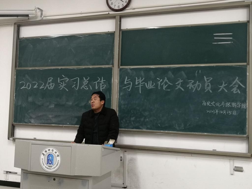 为全面总结2022届历史和地理两个师范专业的教育实习情况和推动毕业论文相关工作的进展,学院于2021年12月15日下午在汉风A楼103教室召开了2022届实习工作总结暨毕业论文动员大会。学院历史、地理两个师范专业的实习和毕业论文指导老师以及全体师范专业2022届毕业生参加了会议。