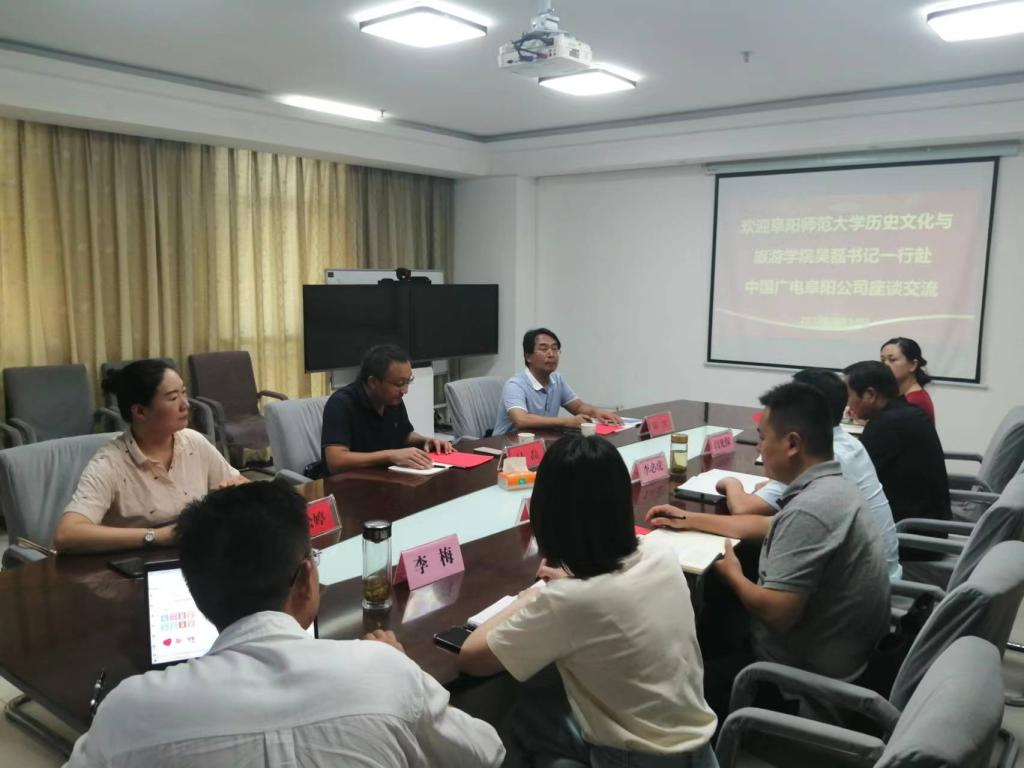 8月12日,学院赴中国广电阜阳公司就智慧旅游进行交流调研。学院党委书记吴磊、院长陈雷、旅游系主任张松婷,中国广电阜阳公司总经理李必虎、副总经理闫光保,阜阳市文化旅游发展中心主任张玉清,安徽腾旅文化科技有限公司运营部经理訾博等参加座谈交流。