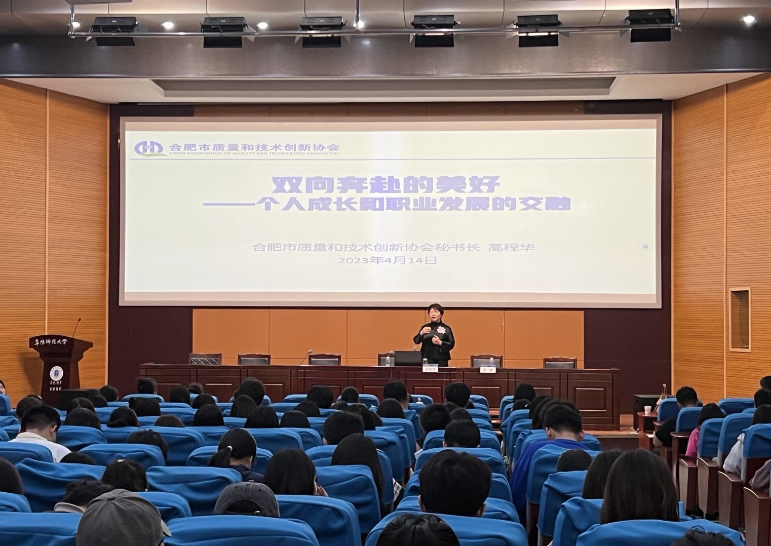 4月14日,学院在西湖校区躬行F楼报告厅举办《双向奔赴的美好——个人和职业的契合》专题讲座,特邀历史系2000届校友、合肥市质量和技术创新协会秘书长高程华担任主讲。讲座由学院党委书记吴磊主持,学院师生共计260余人参加讲座。