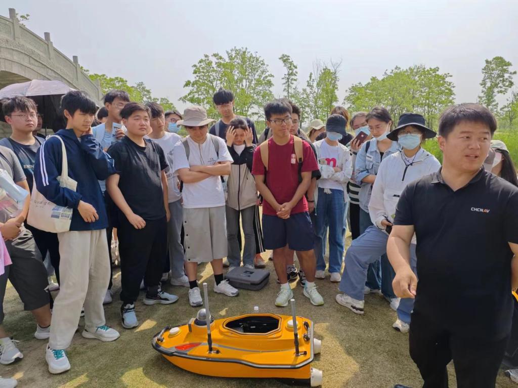 在颍州西湖,同学们使用了无人机进行倾斜摄影测量,采集数据后进行实景建模,通过操控无人船测量了河流水深及底部地形。