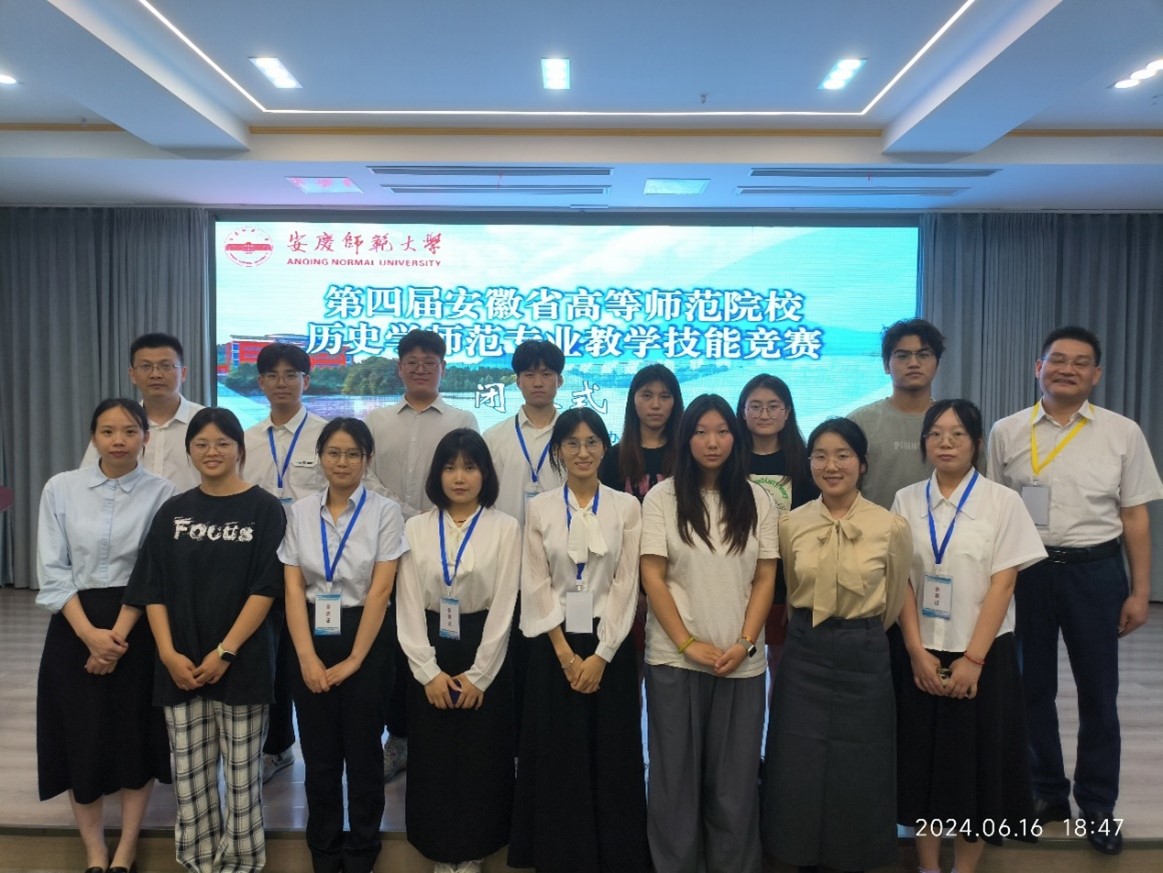 6月15至17日,第四届安徽省高等师范院校历史学师范生教学技能竞赛在安庆师范大学举行。本次大赛由安徽省历史学会、安庆师范大学人文学院主办,阜阳师范大学历史文化与旅游学院、淮北师范大学历史文化旅游学院、安庆师范大学人文学院、池州学院旅游与历史文化学院协办,来自省内高校历史学师范专业64名选手参赛。
