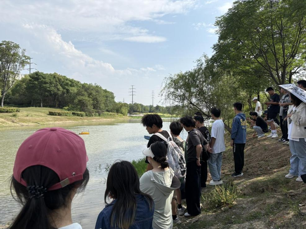 在七渔河畔,同学们操作了无人船系统。无人船搭载高精度多波束测深系统,可以实现全河段动态三维地形测绘。相较于传统人工测量,无人船可自主规划航线,在急流、深潭等危险水域连续作业,既避免了人员涉水风险。其厘米级定位与实时数据传输功能,为构建河道数字孪生模型提供了高分辨率基础数据,精准揭示河床淤积、冲刷等演变特征,为后续防洪调度、生态修复工程提供了科学依据。