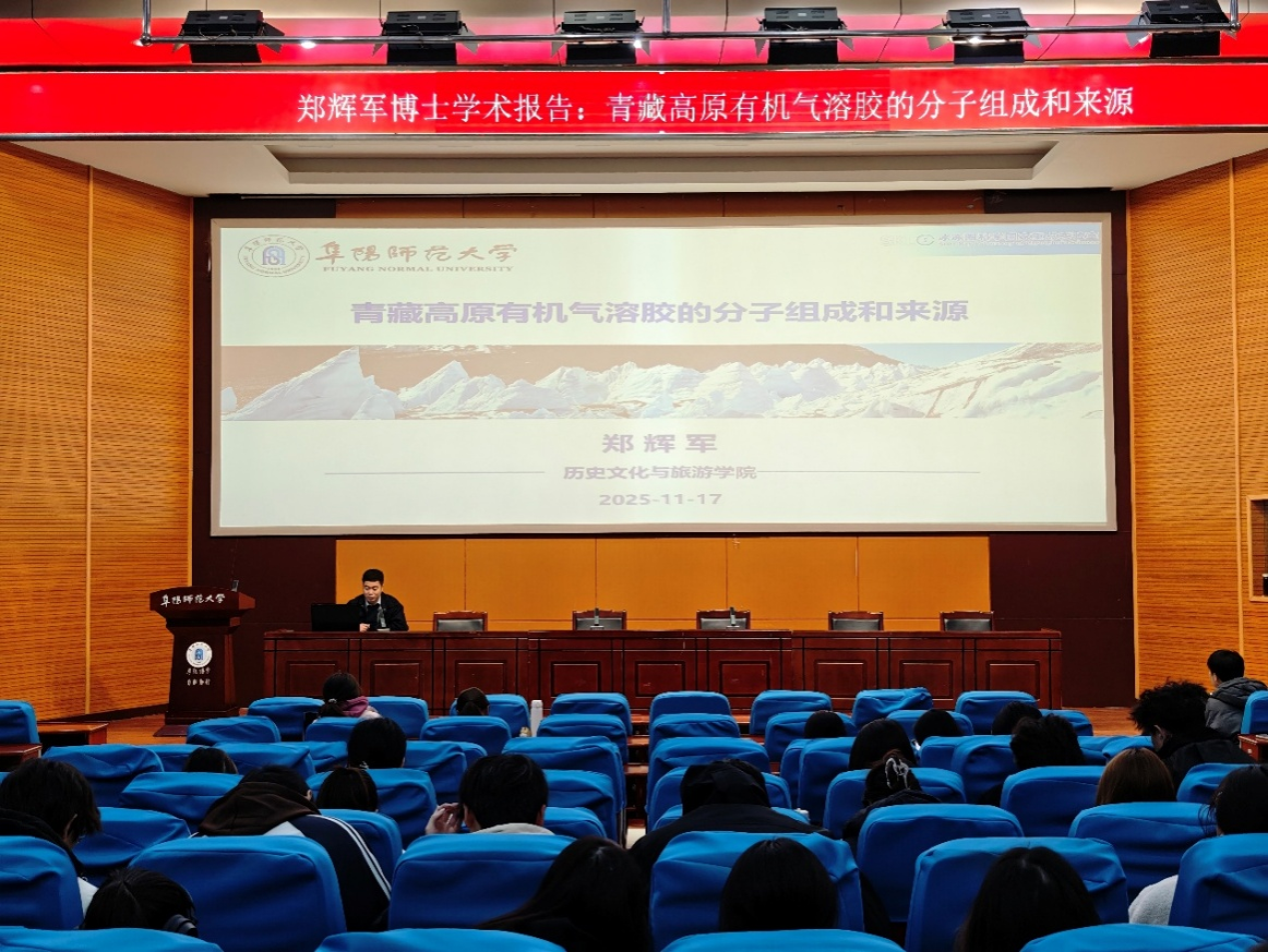 11月17日,郑辉军作题为“青藏高原有机气溶胶的分子组成和来源”的学术报告。郑博士从青藏高原作为“亚洲水塔”与生态屏障的独特地位出发,指出高原生态环境敏感脆弱,系统阐释了开展高原大气有机气溶胶研究的科学价值与现实意义。他重点介绍了多环芳烃、脱水糖、糖醇等有机组分的时空分布与来源特征,指出南亚生物质燃烧对高原边缘区域气溶胶具有显著影响,揭示了污染物跨境传输的复杂机制。在互动环节,郑博士就青藏高原大气环境未来研究方向与现场师生互动交流,对同学们的提问进行了耐心解答。