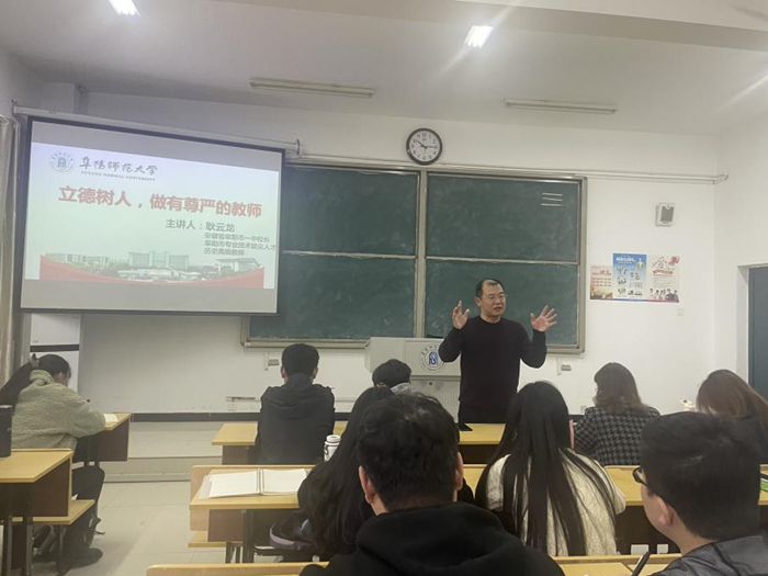 2020年11月17日上午10:00,阜阳一中校长耿云龙应学院邀请,在西湖校区汉风A楼103教室作了题为“立德树人,做有尊严的教师”的学科教育讲座。学院2019级、2020级学科教学(历史)专业全体研究生及2019级本科生聆听了讲座,学院党委副书记吴磊主持讲座。