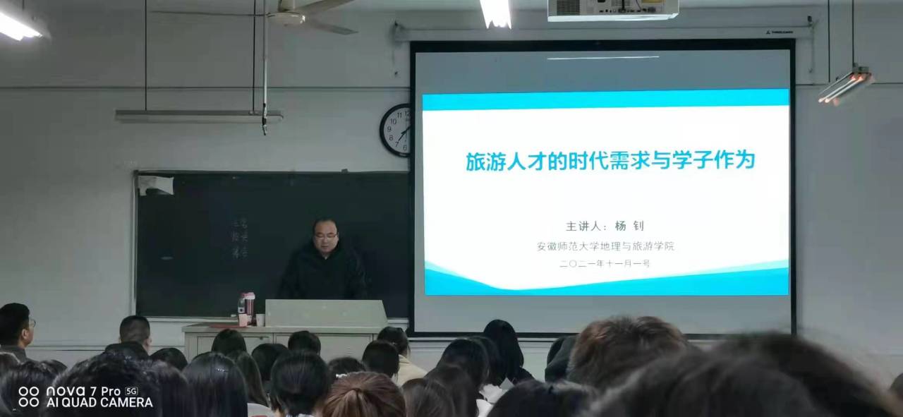 应学院邀请,安徽师范大学杨钊教授于2021年11月1日晚,在教学主楼301教室作了题为《旅游人才的时代需求与学子作为》的学术讲座。报告会由院长陈雷教授主持,学院副书记卞会泉、旅游系主任张松婷以及旅游系全体教师和学生聆听了本次讲座。