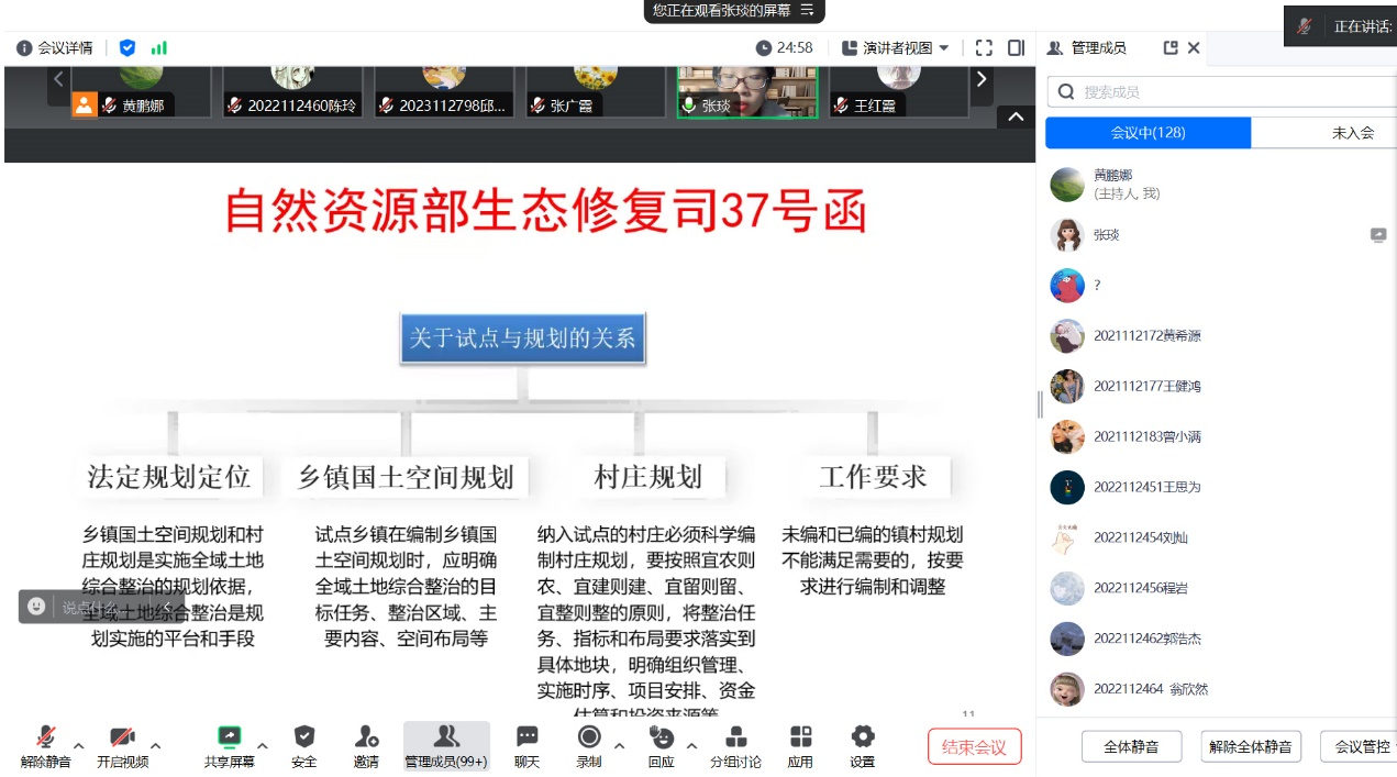 为帮助同学们深入了解土地整治领域的前沿动态,提升专业素养。学院邀请武汉大学博士、自然资源部国土整治中心工程师张琰开展题为“全域土地综合整治理论与实践”的线上讲座。本次讲座由张广霞老师主持,人文地理与城乡规划专业全体同学参加此次讲座。