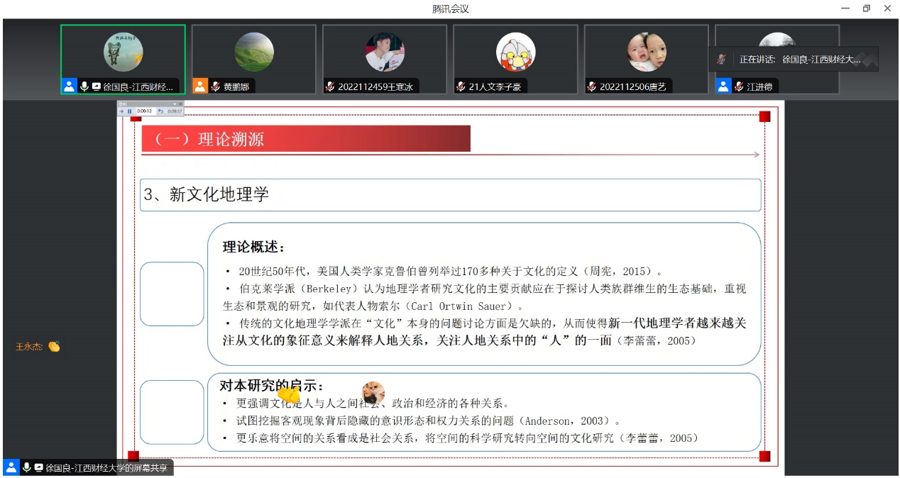 为帮助同学们深入理解土地情感相关理论以及本土实践情况,提升专业素养。11月12日晚,学院特邀理学博士、江西财经大学副教授徐国良开展题为“土地依恋:从西方理论到本土实践”的线上学术报告讲座。本次讲座由江进德主持,人文地理与城乡规划专业全体学生参加。