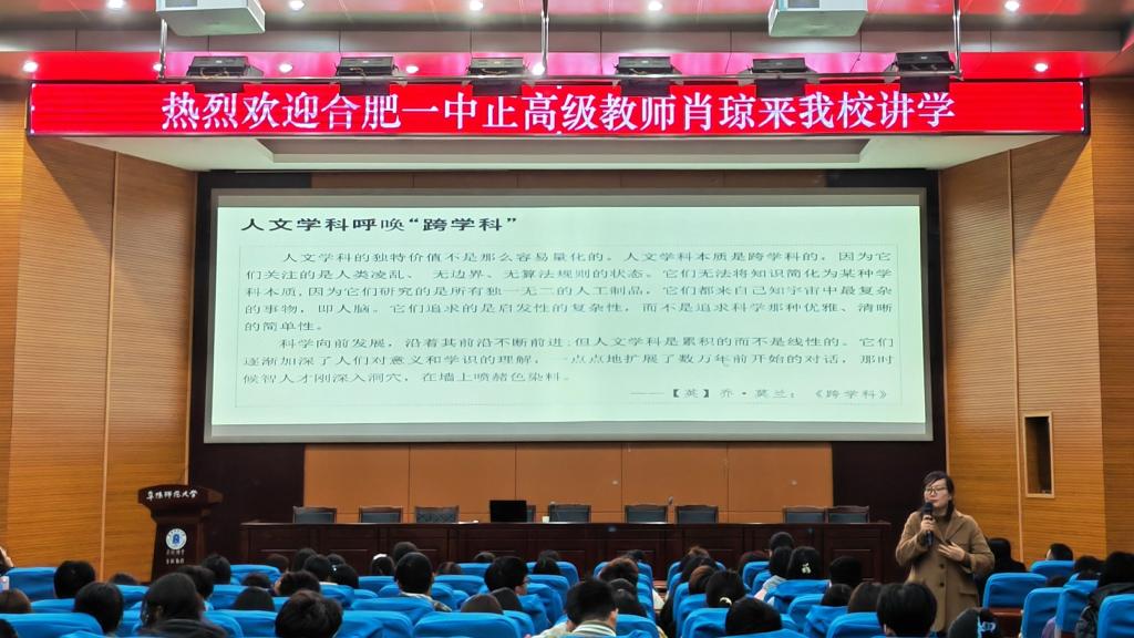 11月16日下午,合肥市第一中学瑶海校区执行副校长、正高级教师肖琼应学院邀请在西湖校区躬行F楼报告厅作题为“从“心”开始 无问西东”的学科教育讲座。学院2022级、2023级全体历史学学生参加本次讲座,讲座由学院副院长郭从杰教授主持。