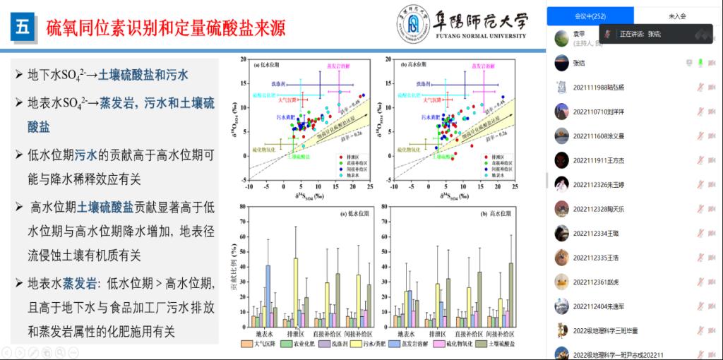 11月13日下午14点30分,张结作题为“中国北方典型泉域岩溶水NO3-和SO42-来源识别及升高机理研究”的专题讲座。他在对水化学与同位素基本理论进行简要介绍的基础上,详细回顾了中国北方岩溶研究现状,并分析了已有研究存在的问题。最后,以济南泉域为例开展案例研究,重点介绍了济南泉域岩溶水水化学特征及时空变化规律、硝酸盐与硫酸盐生物地球化学循环过程、硝酸盐与硫酸盐来源的定性识别和定量解析及硝酸盐与硫酸盐的升高机理等内容。