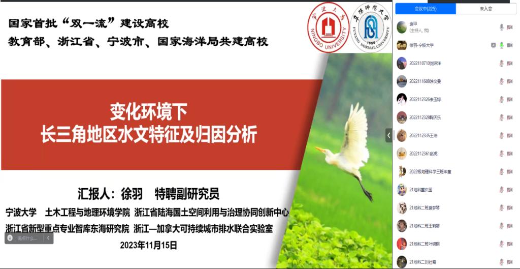11月15日上午9点,徐羽作题为“变化环境下长三角地区水文特征及归因分析”的学术讲座。他首先从宏观层面揭示了长三角地区极端干湿事件的变化规律;然后,分析了强人类活动下长三角地区的土地利用与水系格局特征,在此基础上探讨了非一致性条件下的水文特征与洪水频率估算;最后,以苏州城市大包围为典型,构建了高精度的暴雨洪水模拟模型,深入探究了高度城市化地区的暴雨洪水演变规律及其驱动机制。