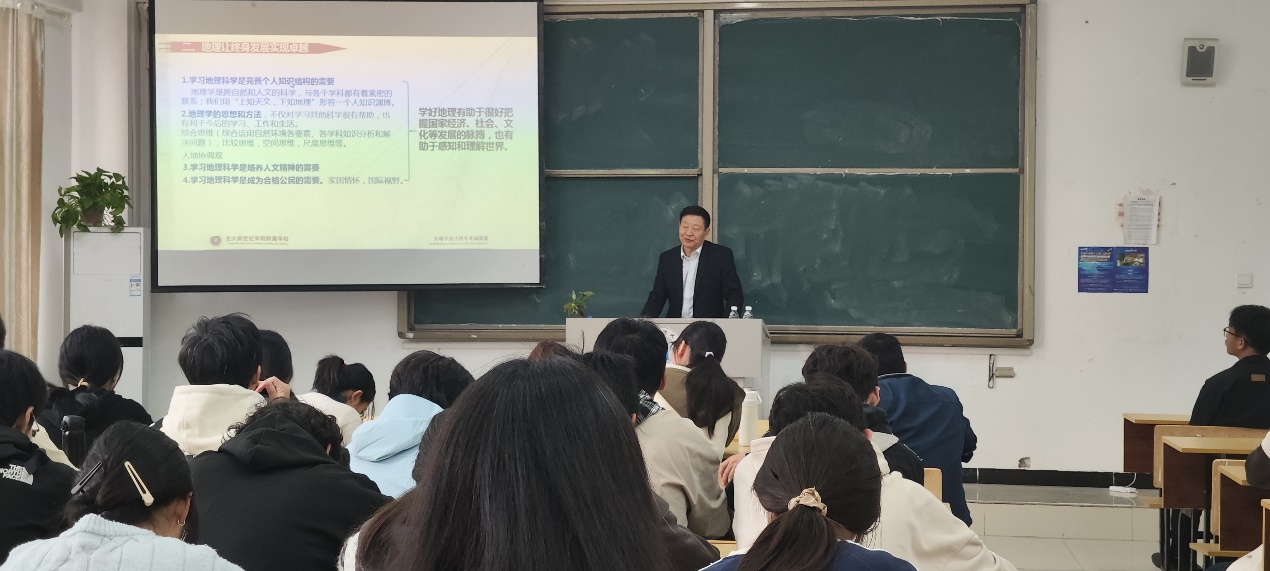 为提升地理科学专业新生对地理学科的认知,激发其学习兴趣与热情,并为其终身发展打下良好的基础。11月14日,学院邀请北大新世纪阜阳附属学校的中学地理特级教师何长剑老师,在汉风A楼107教室,作题为“做地理人——让生活富有品质,让终身发展日趋卓越”的学科教学讲座,地理科学专业2024级全体新生及地理科学教研室教师代表聆听了讲座,讲座由地理系主任胡文峰主持。
