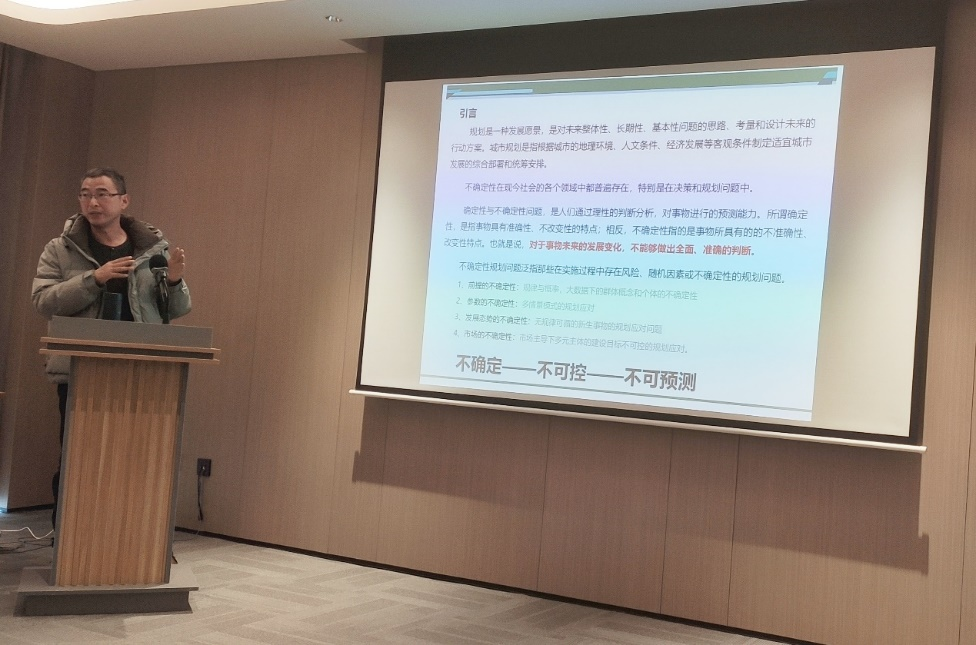 主题报告环节,河南财经政法大学城乡规划学院孟德友教授以“城市多中心空间结构理论、识别及规划建设实践”为题,以郑州市为例,阐述了城市多中心空间结构理论、识别及规划建设,具有很强的借鉴意义。安徽建筑大学建筑与规划学院副院长顾康康教授以“淮河流域安徽段行蓄洪区乡村承洪韧性评估与治理路径研究”为题,分享如何结合国家政策和现实需要进行研究选题与思路设计,强调研究应从现实中来再到现实中去,为政府制定相关决策,提供了极富价值的参考。阜阳市城乡规划设计研究院有限公司规划一所所长沈化修高级工程师以“基于不确定性的规划应对实践”为题,通过在颍州区村庄布点规划、市开发区中小学布局研究等规划项目中遇到的不确定性情况的思考及解决办法,认为动态规划思维是解决不确定性的一种较好的方法路径。