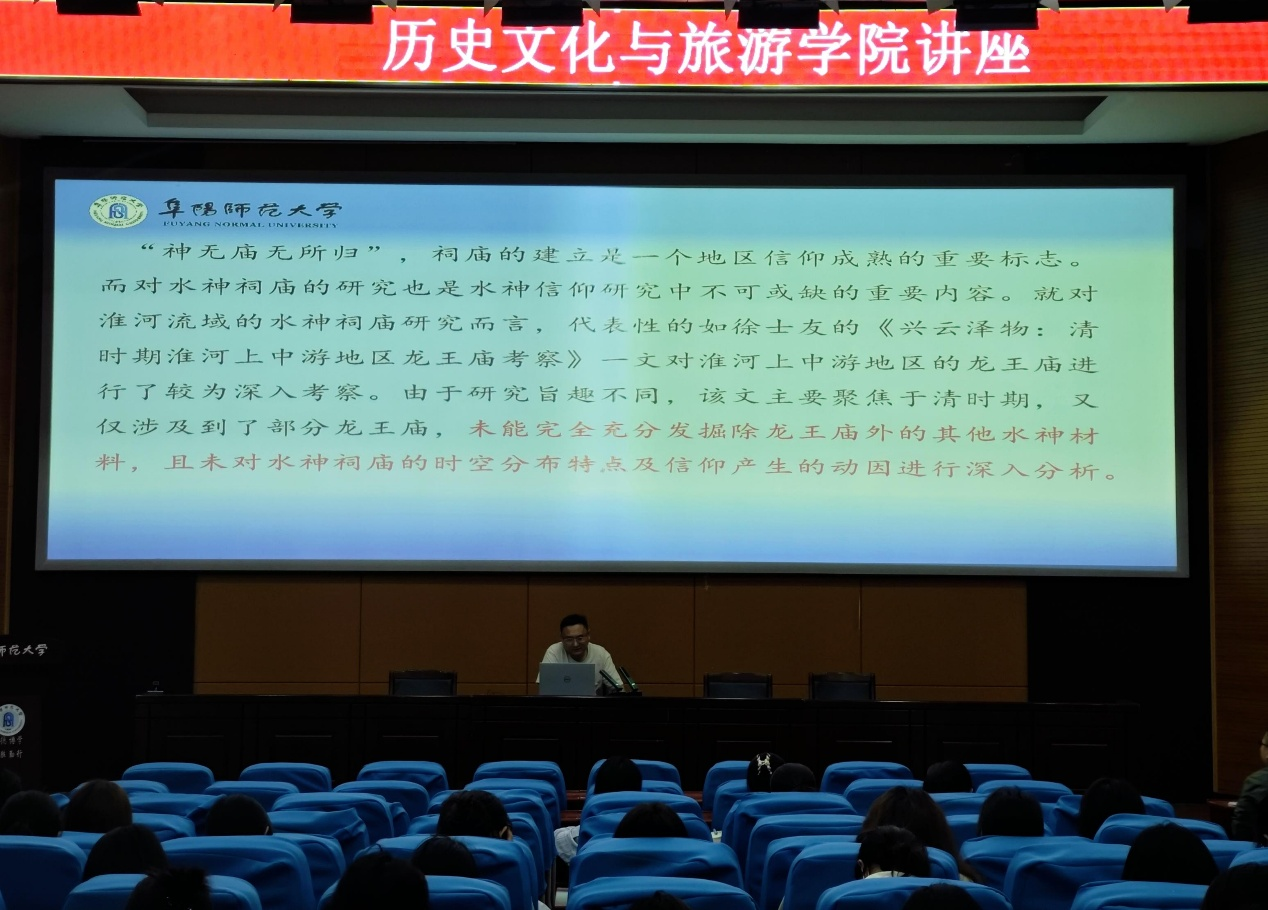 5月9日上午,学院在躬行楼F楼报告厅举办“历史景观地理视域下淮河流域水神信仰”专题学术讲座。本次讲座由学院教师李东辉博士主讲,历史系主任胡乐伟主持,2022级和2023级历史学(师范)专业全体本科生和部分教师代表参加。